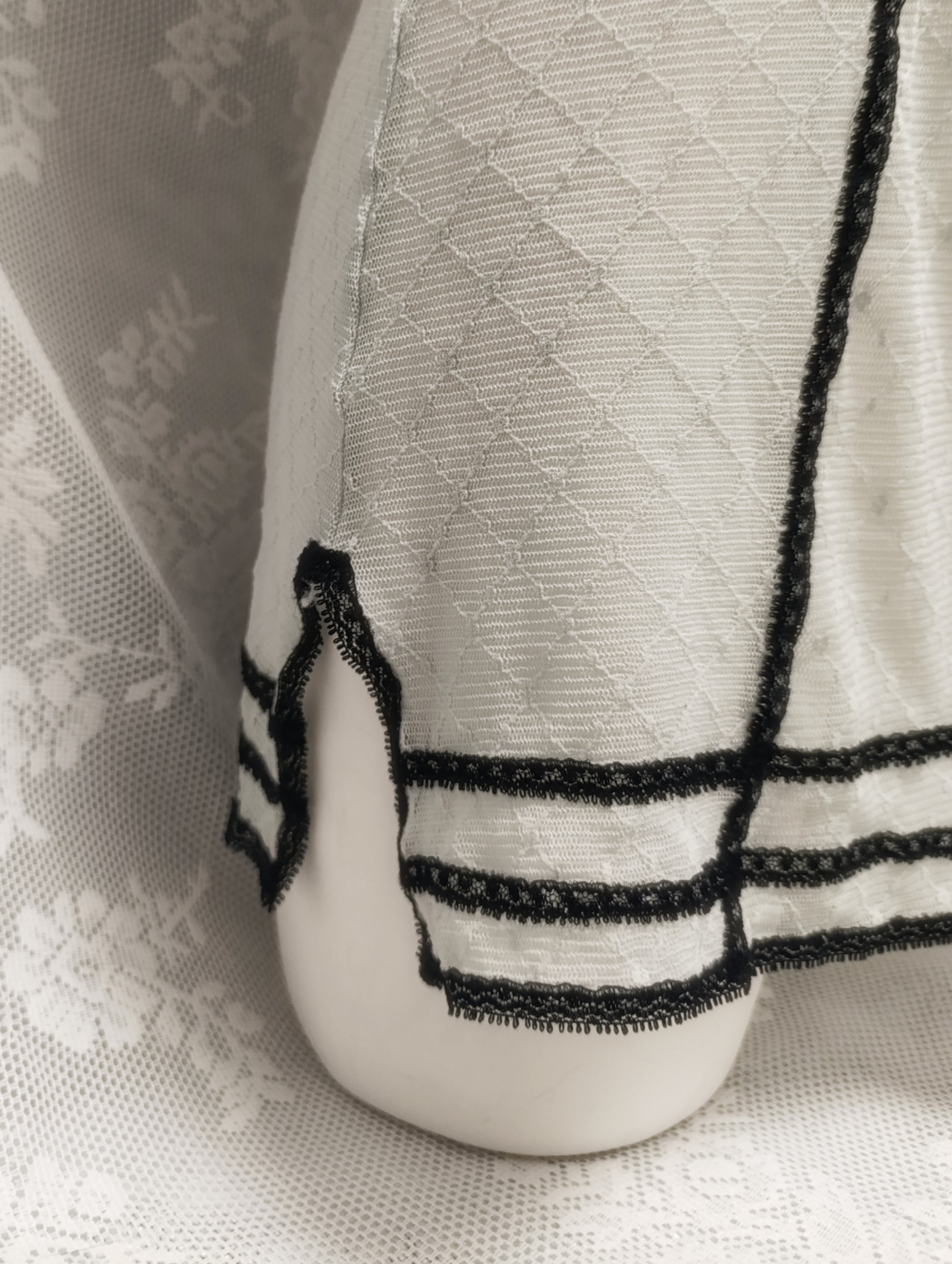 defects: one place of the lace was torn and has been sewn; possible protruding threads and minor pilling