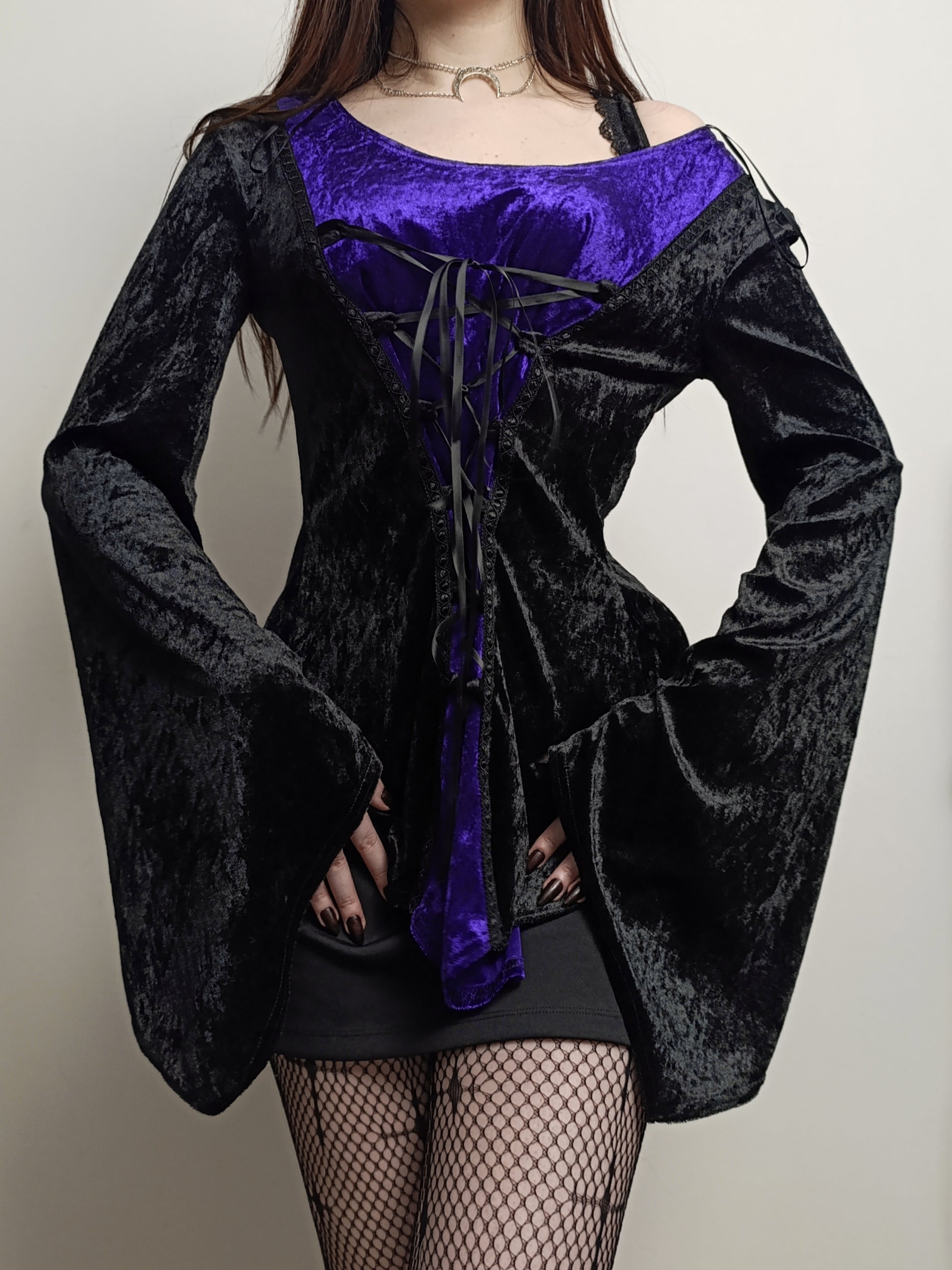 Piękna bluzka/tunika marki Laughing Vampire, wykonana z welurowego materiału w kolorze czarnym i fioletowym, z ozdobnym wiązaniem z przodu ✮⋆˙
