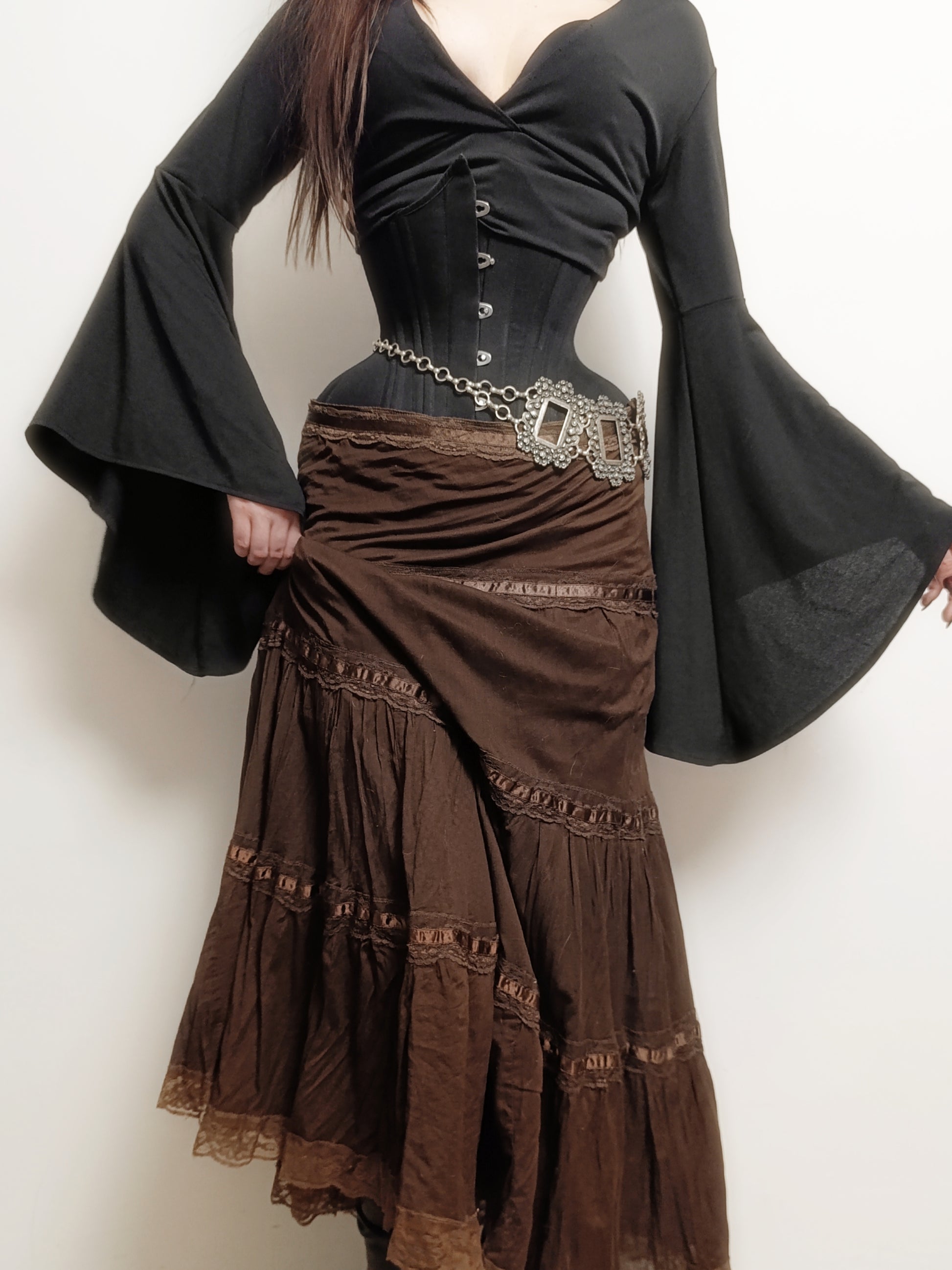 Brązowa spódnica maxi o mocno rozkloszowanym kroju, ozdobiona dekoracyjnymi wstążeczkami oraz koronkami ⛦