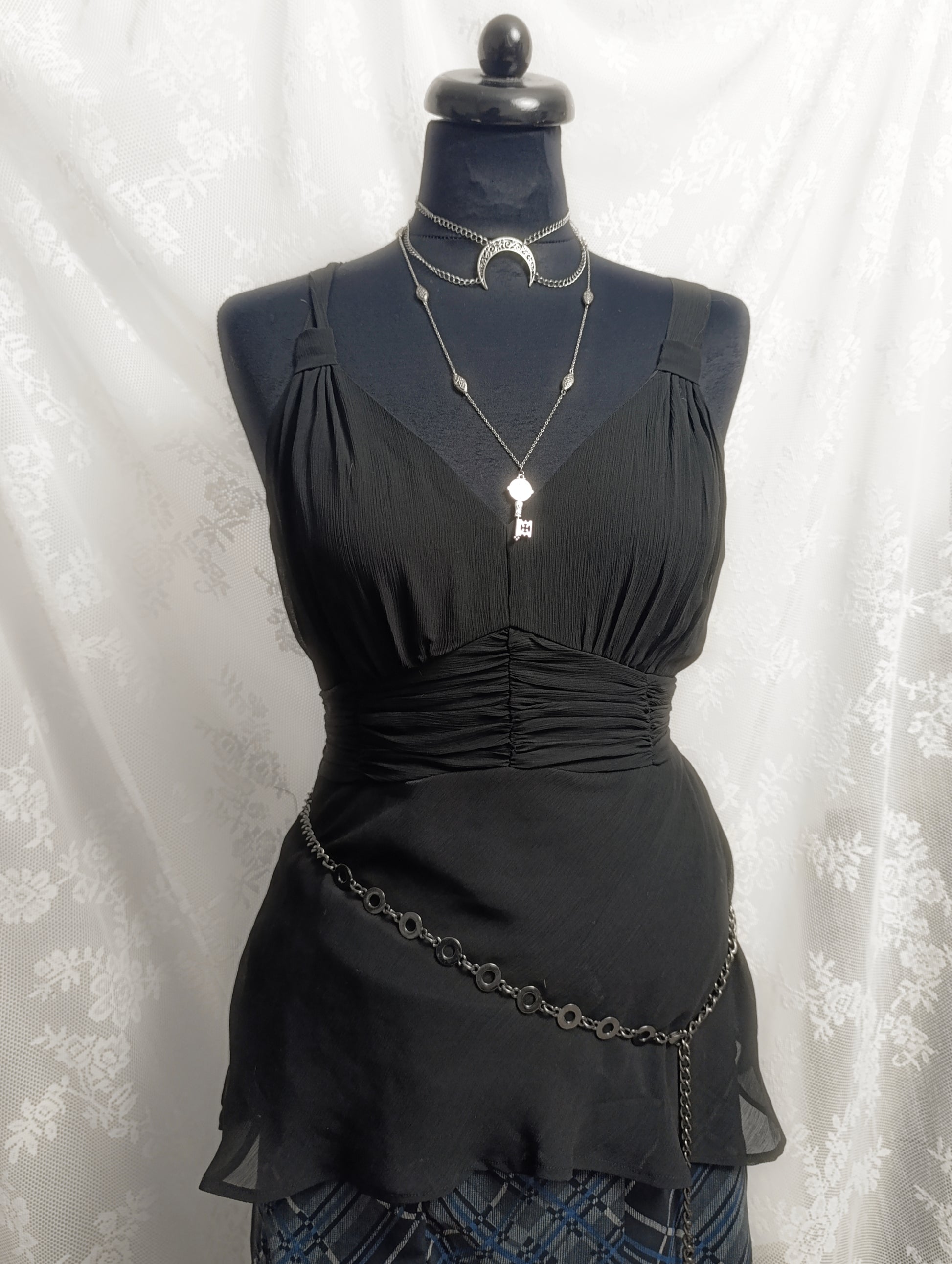 Czarny top wykonany z siateczki, z wiązaniem na plecach umożliwiającym regulację dopasowania 𓋹