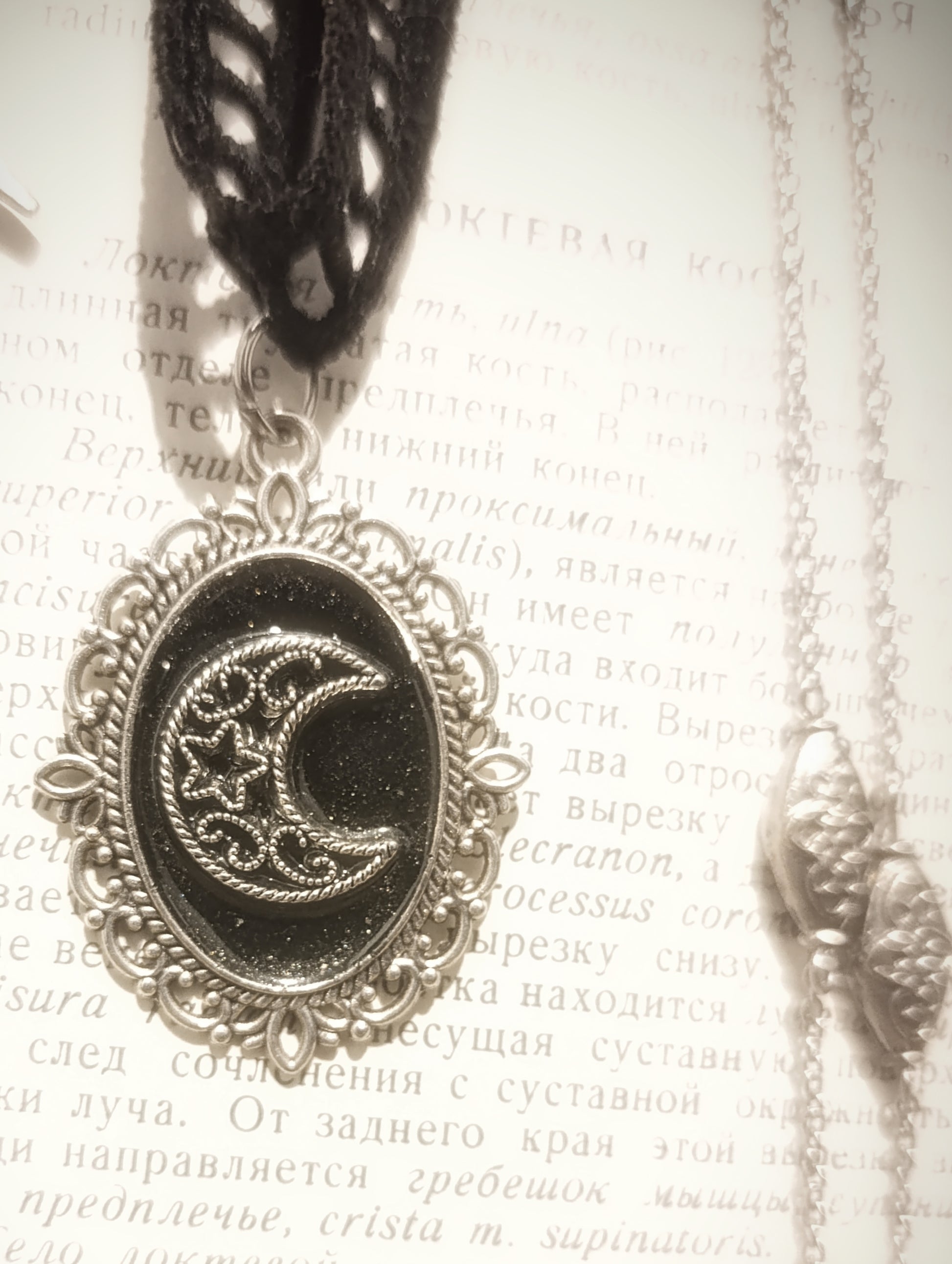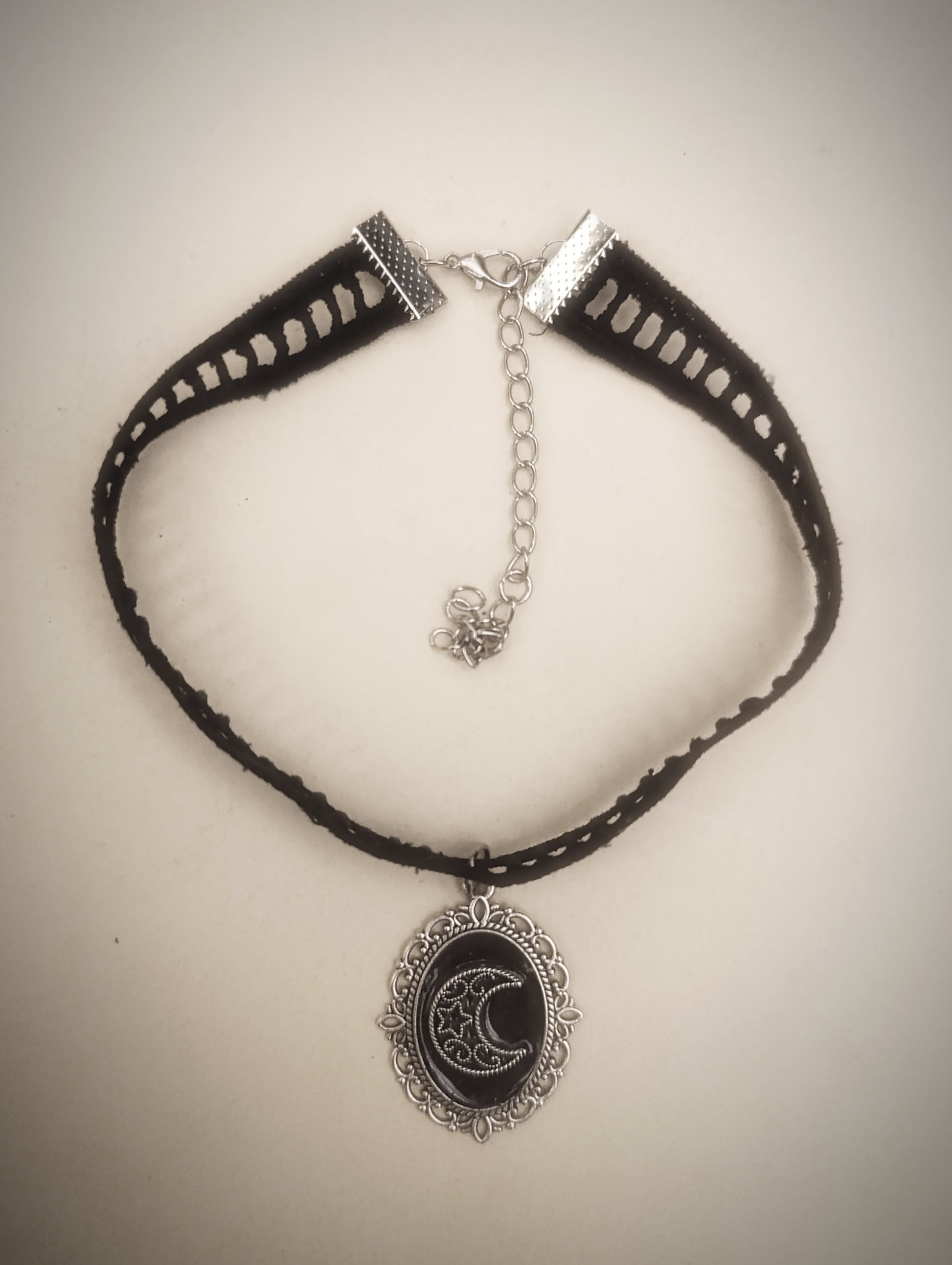 Czoker z połyskującą zawieszką z motywem księżyca, wykonany na czarnej, bawełnianej tasiemce pochodzącej z recyklingu starego gorsetu- dlatego dostępna jest tylko jedna sztuka, która nigdy nie wróci do sklepu ˚☽˚.⋆