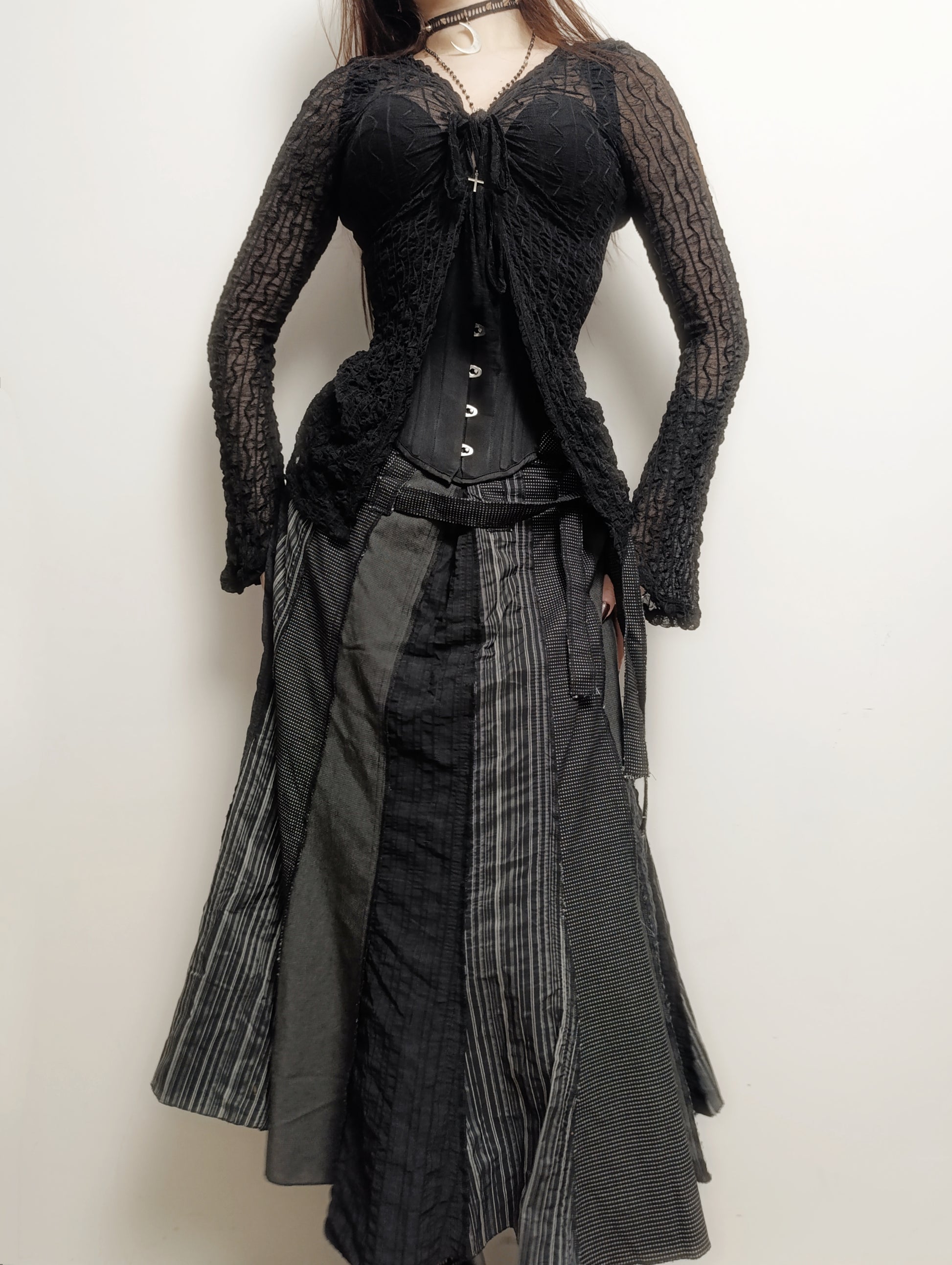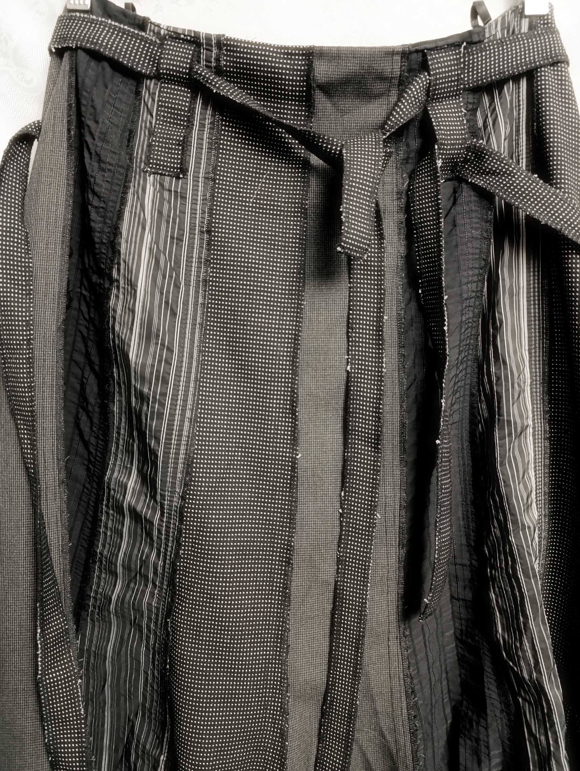 Vintage spódnica patchworkowa wykonana z różnych materiałów we wzory kropek, pasków i kratki, z ozdobnie strzępionymi krawędziami i dodatkowymi paskami ⋆☥⋆