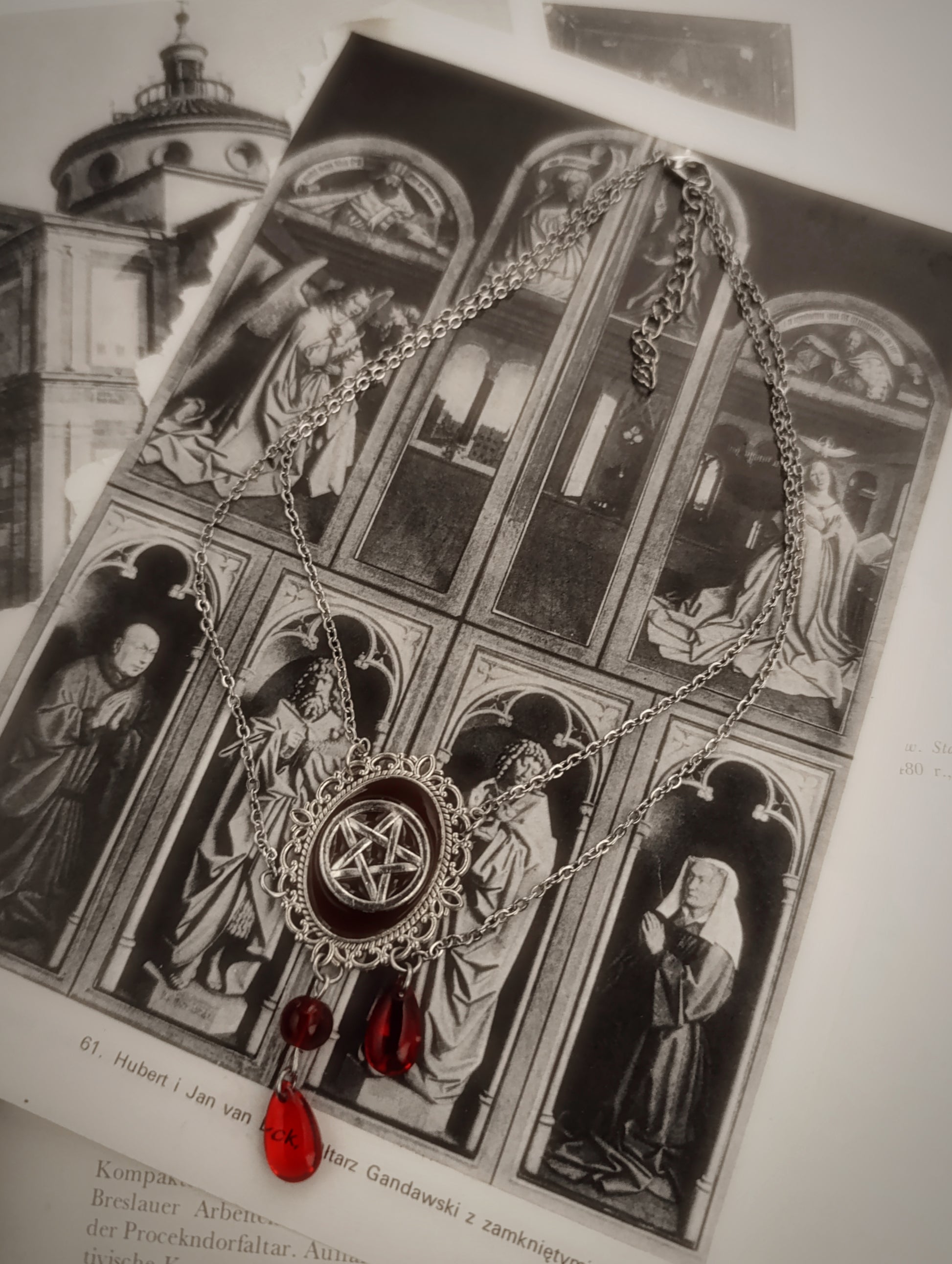 Classic choker with a pentagram, finished with asymmetrical red beads 🗝️